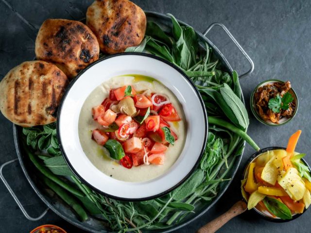 Lima bean salad Lima bean salad, tomatoes, garlic, green chilli, shallots, red chilli oil, lemon and handmade frena bread