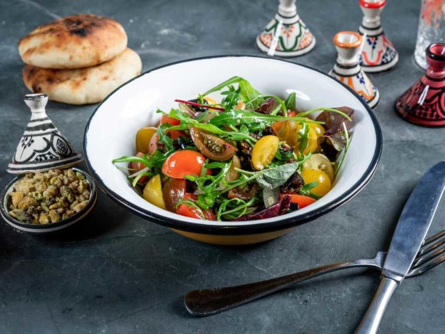 Cherry tomato salad Cherry tomatoes, lettuce, arugula, basil, garlic confit, shallots, olives, chili, pistachios and king nuts