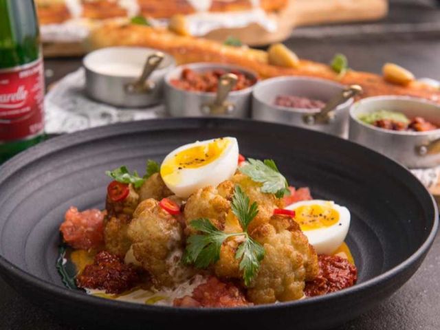 Sabih Cauliflower Fried cauliflower, tahini, egg, hot pepper, harissa, tomatoes, amba and parsley