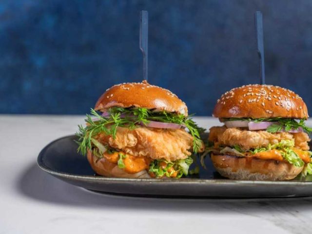 Crispy Salmon Two slider buns with crispy salmon, spicy mayonnaise, lettuce, red onion, cornichon pickles and a chili dip