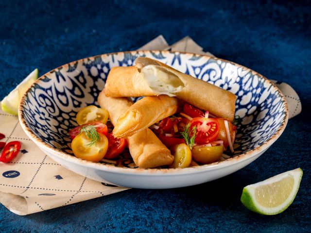 Cheese Cigars Cigars filled with cheese and pesto, tomatoes seasoned with preserved lemons, fresh chilli and coriander with a tzatziki dip